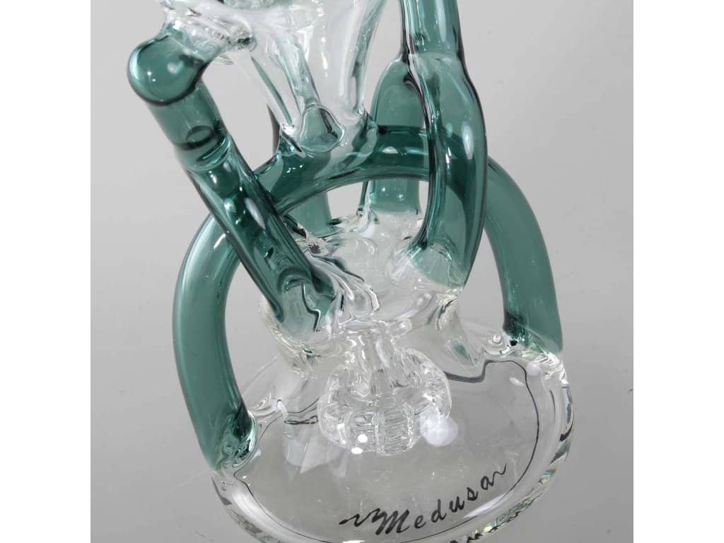 Efektivní tupování s výjimečným Recycler Dab Rig MEDUSA od BLAZE GLASS® . Stejně jako mnoho cest vede do Říma, mnoho cest vede do vodní komory a zpět v roztomilé skleněné bublině. To je také způsob, jakým je bongová voda nasávána různými trubicemi, aby pak proudila zpět do hlavní komory. Voda je přitom pokaždé obohacena o čerstvý kyslík, tj. recyklována. Na stěně potrubí se přitom usazují nežádoucí vedlejší produkty kouře.